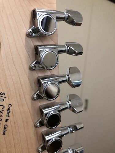 "白い楽器"がコンセプトのジャスマスター改修。 一応の完結編、ペグの交換。 これは標準装備のロトマチックペグ。 使い勝手には特に問題ありませんが、今回はとにかくゴトーのマグナムロックにしたいわけです。 そして交換後。 ちょいとおもちゃっぽいという…